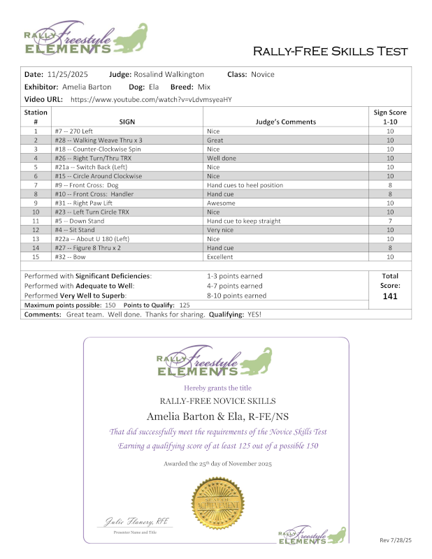 W międzyczasie zorganizowałam dla najbliższych kursantów kurs z RallyFrEe, który zakończył się zdanymi Skill Testami jednej z uczestniczek i planami na wspólne przygotowanie do zawodów w 2026 roku. Obecnie pracuję nad przygotowaniem Twinsów do Skill Testów, a z Elzą poznajemy znaki z wyższej klasy.